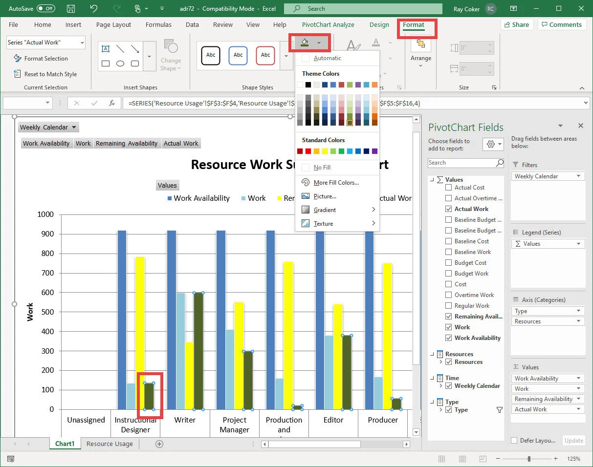 The report is based on an existing template formatted with shades of gray. That is easily changed by selecting the Excel Format tab on the ribbon, selecting a value bar in the report, and selecting a fill color.