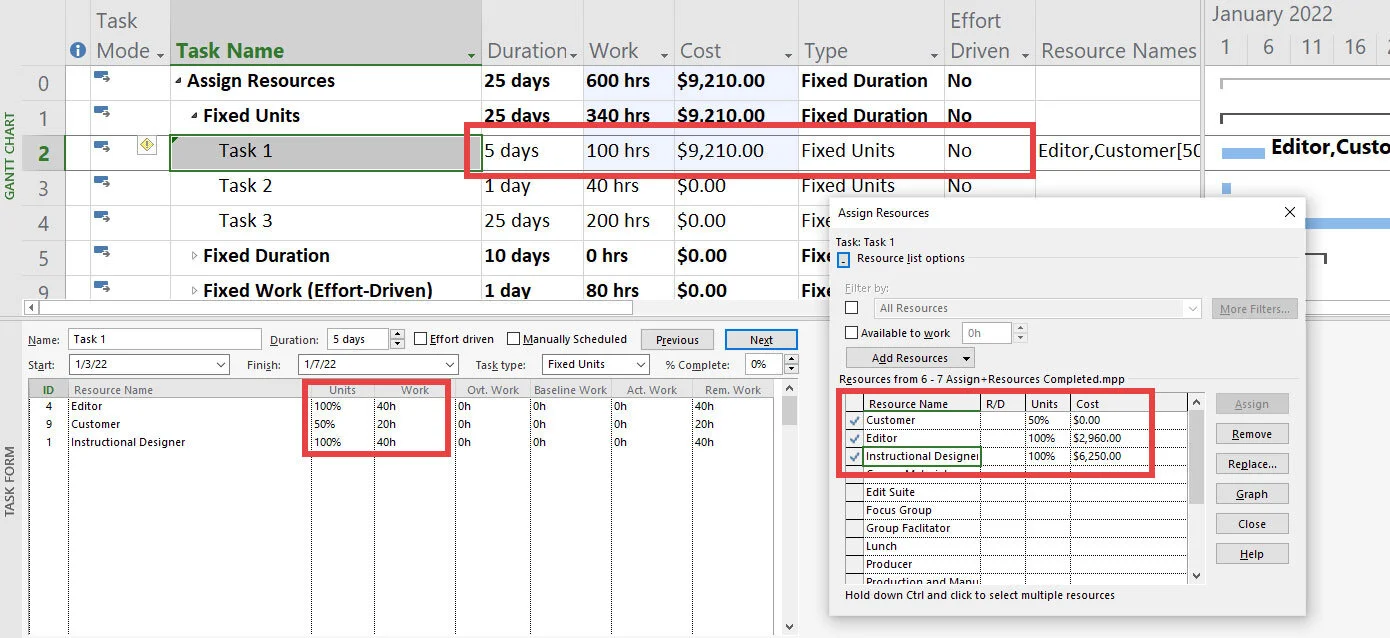 It is essential to mention that Work and Cost can be entered and not calculated as a function of resource assignments.