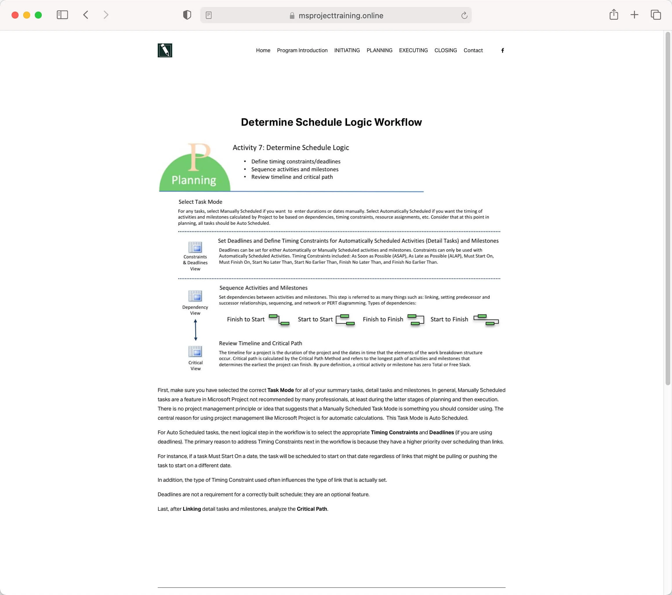 Watch the video below on Timing Constraints (3:32 minutes). Using an example of scheduling a personal tax return. (Not that you would ever do that, this is just an example.) This video is designed to illustrate how Timing Constraints drive the schedule along with the types of links you use.