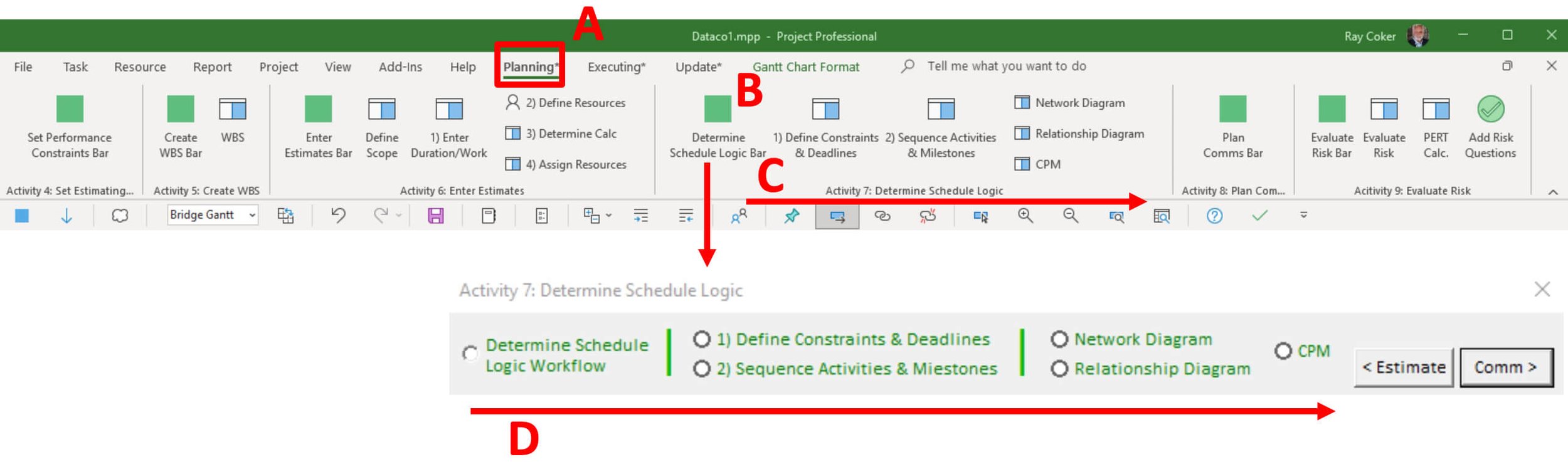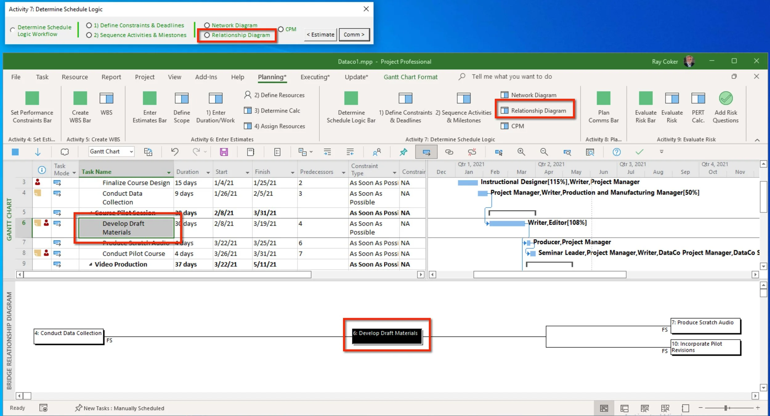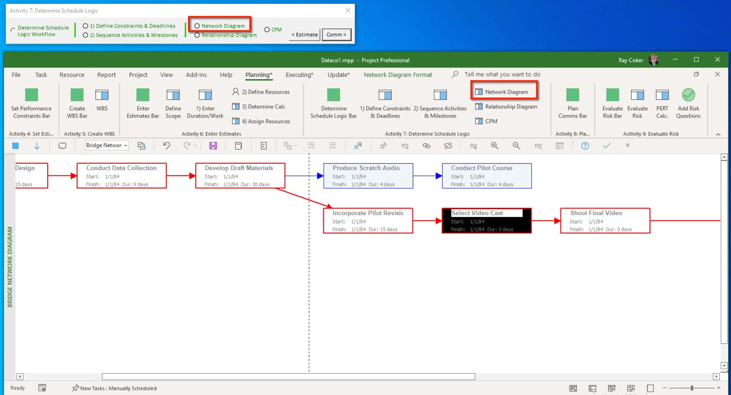 You can either use the Planning* tab on the ribbon or the Activity 7: Determine Schedule Logic floating toolbar to walk through this Activity.