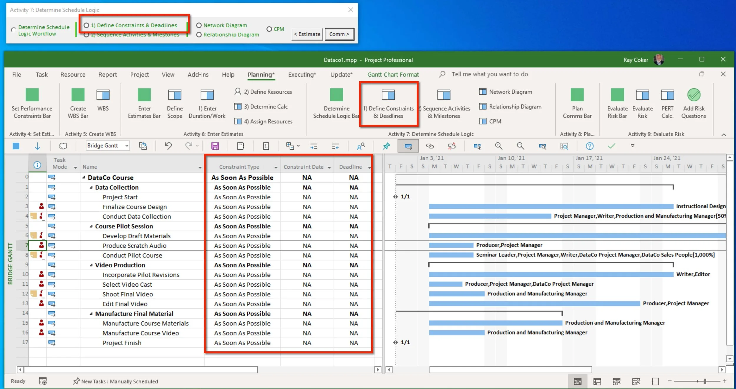 A Gantt Chart view is applied. The table in the view has the Constraint Type, Constraint Date and Deadline Dates fields inserted.